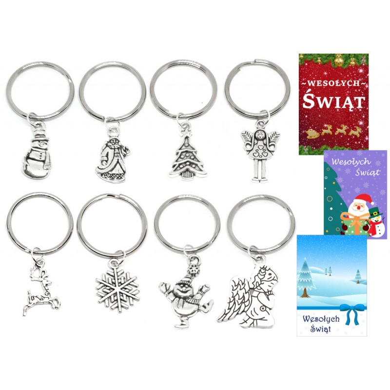 W opakowaniu: 8 breloczków (jak na zdjęciu - bez możliwości wyboru), 8 kartek - do wyboru, 8 celofanów