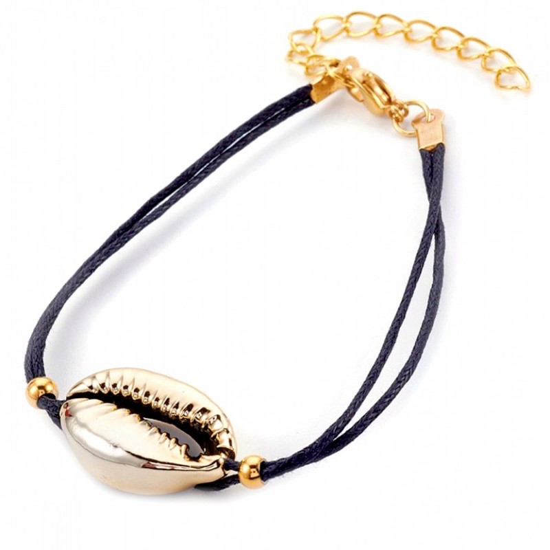 Bransoletka wykonana jest ze sznurka bawełnianego woskowanego o grubości 1mm oraz muszelki w kolorze złotym.