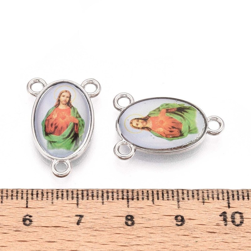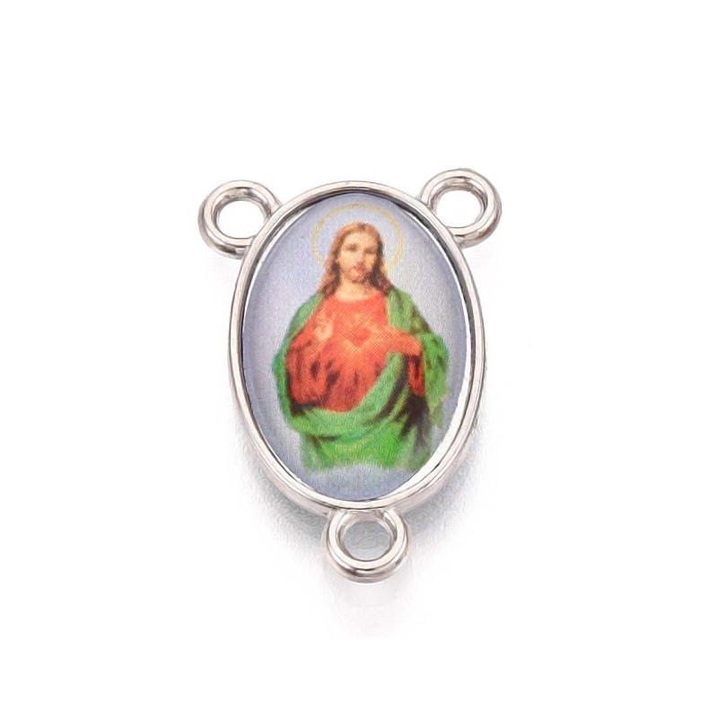 Piękny metalowy element do różańca z zatopionym w tworzywie sztucznym wizerunkiem Jezusa.