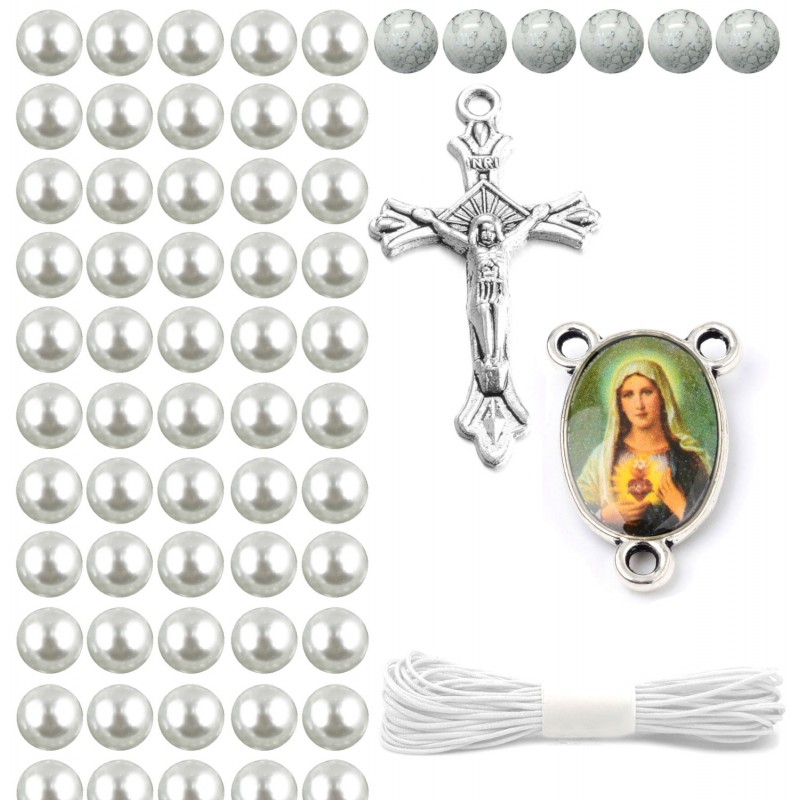 Wykonanym różańcem można obdarować bliską osobę. Klasyczne koraliki perełki pięknie prezentują się na różańcu. ozdobny krzyżyk oraz łącznik dodają elegancji.