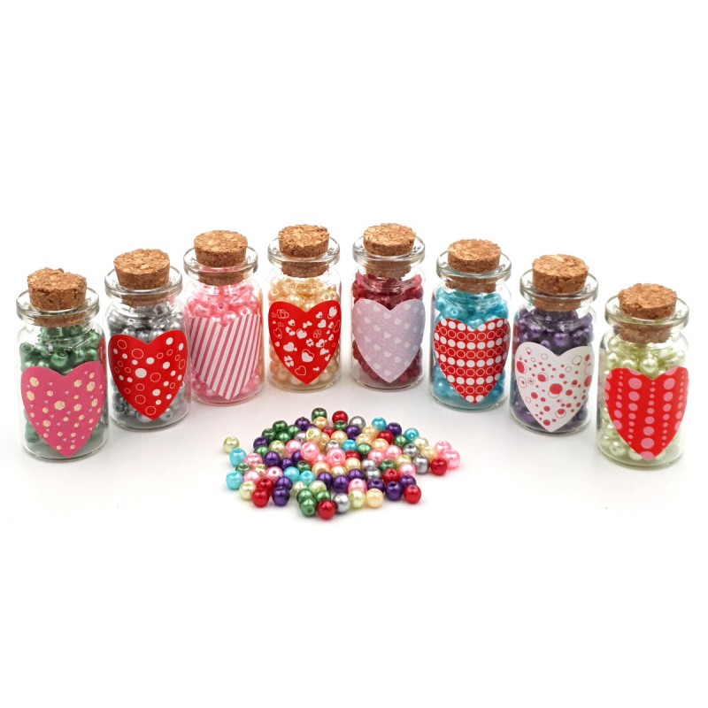 Prezentowany produkt to zestaw koralików perełek o średnicy 4mm zapakowanych w szklane buteleczki z naklejkami serduszkami.