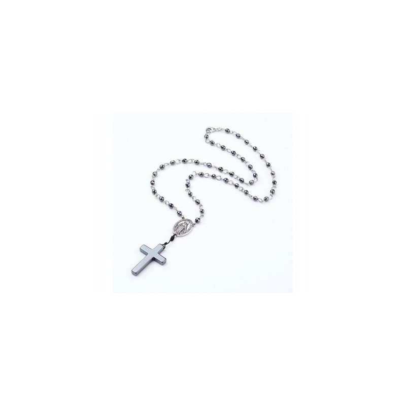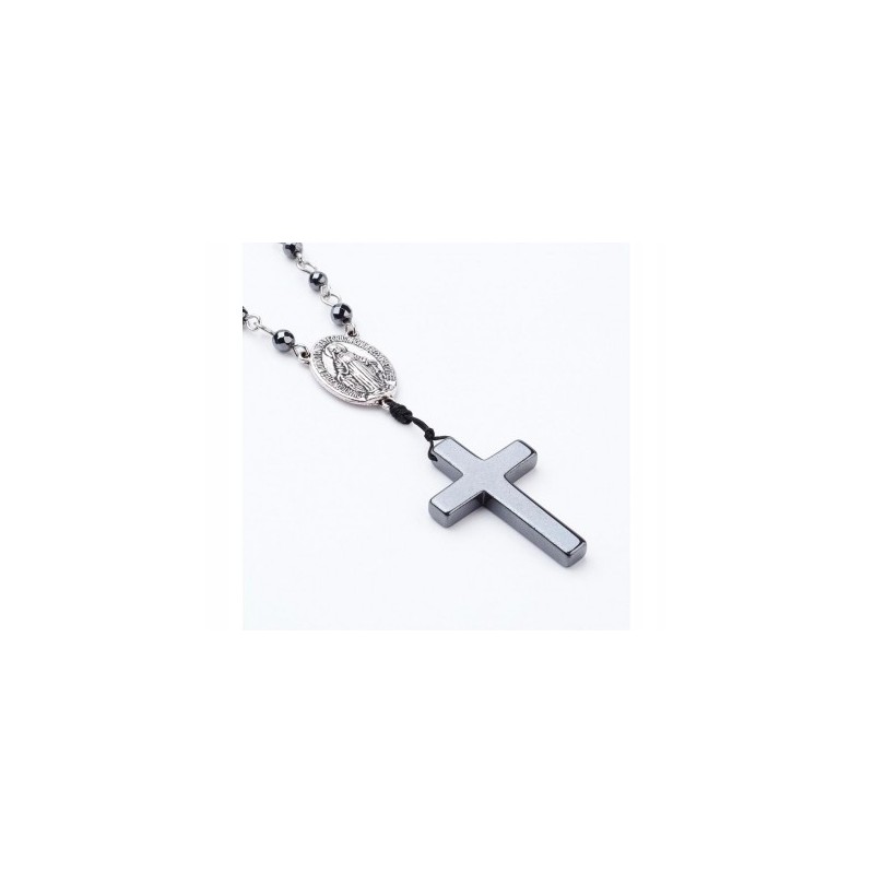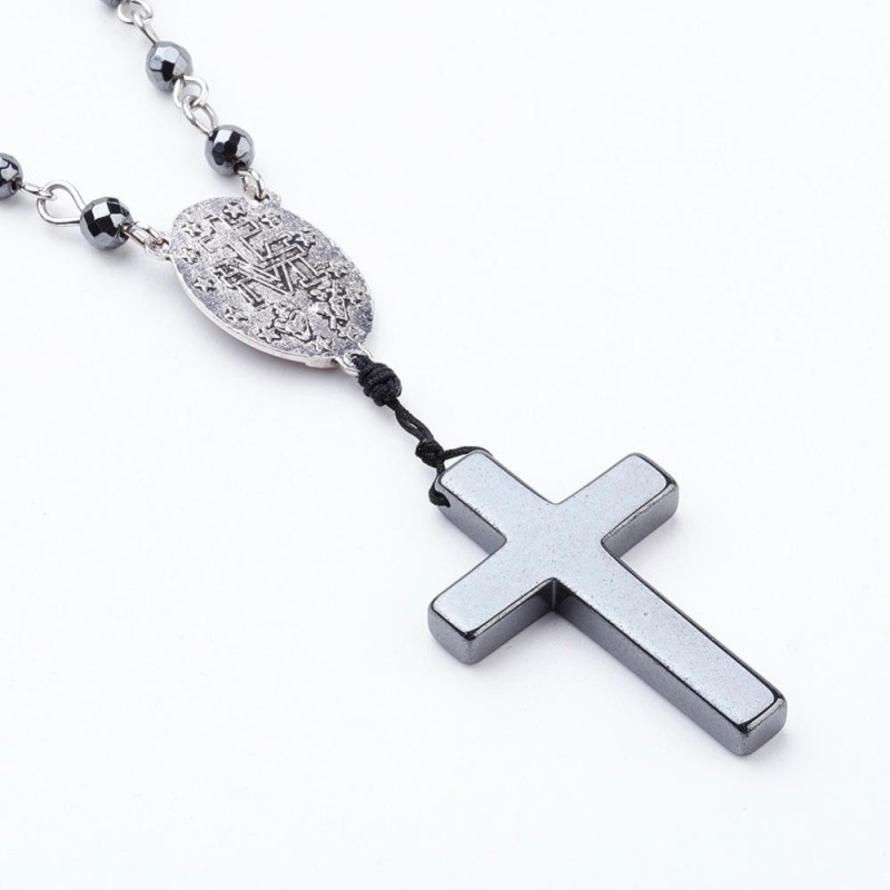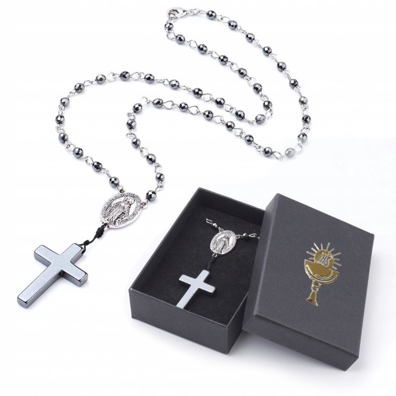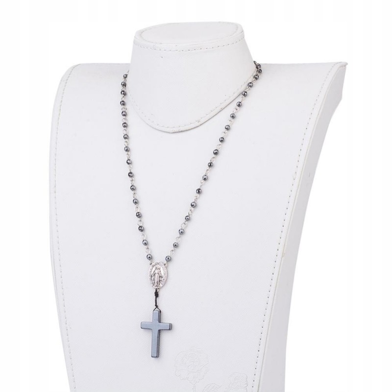 Różaniec został wykonany z pięknych mieniących się fasetowanych koralików, co nadaje mu elegancji. Zakończony gładkim krzyżykiem mieniącym się jak paciorki, na łączniku widnieje wizerunek Matki Boskiej. Idealny na prezent z okazji I Komunii Świętej, chrztu lub bierzmowania. Posiada zapięcie, dzięki czemu można założyć go również na szyję.