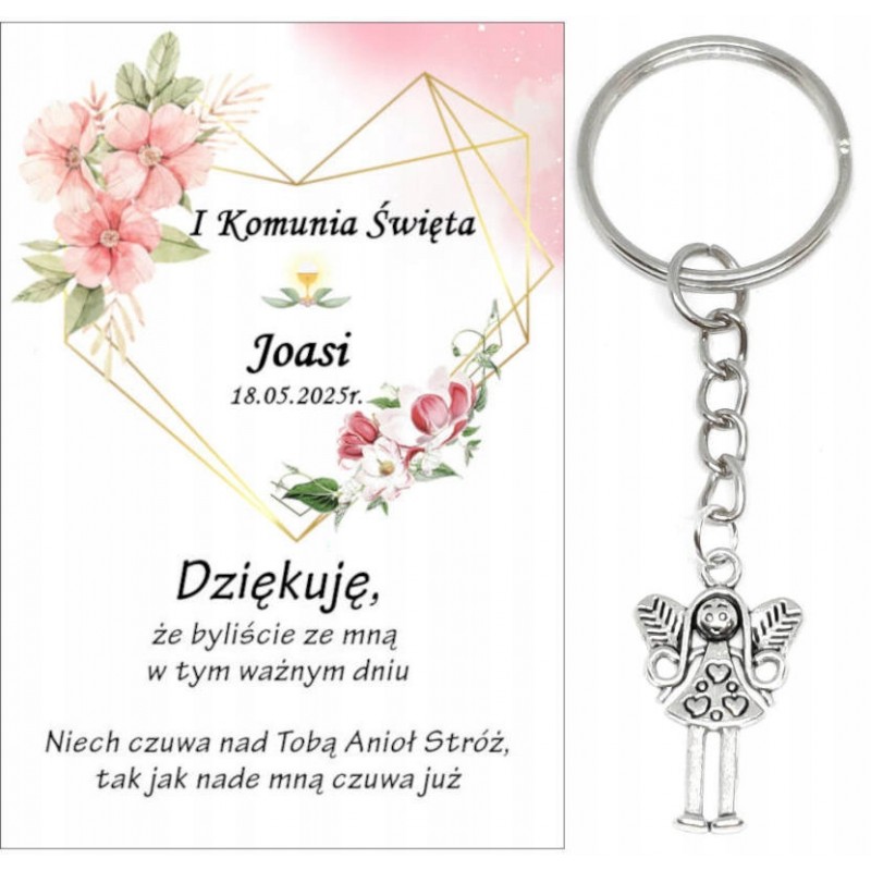 PAMIĄTKA PREZENT UPOMINEK DLA GOŚCI - BRELOCZEK ANIOŁEK Z OZDOBNĄ KARTECZKĄ NA KOMUNIĘ