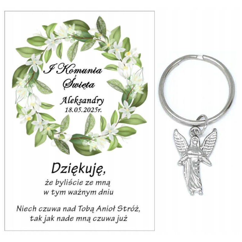 PAMIĄTKA PREZENT UPOMINEK DLA GOŚCI - BRELOCZEK ANIOŁ Z OZDOBNĄ KARTECZKĄ NA KOMUNIĘ