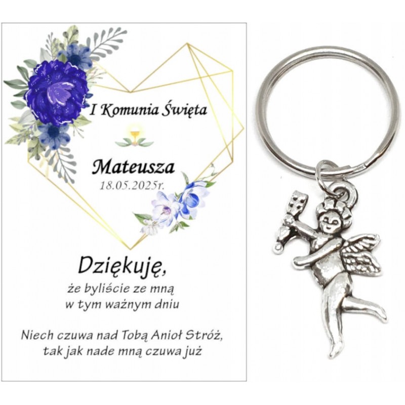 PAMIĄTKA PREZENT UPOMINEK DLA GOŚCI - BRELOCZEK ANIOEK Z OZDOBNĄ KARTECZKĄ NA KOMUNIĘ