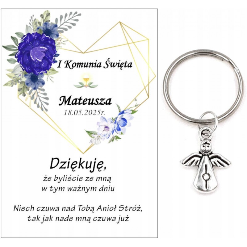 PAMIĄTKA PREZENT UPOMINEK DLA GOŚCI - BRELOCZEK ANIOEK Z OZDOBNĄ KARTECZKĄ NA KOMUNIĘ