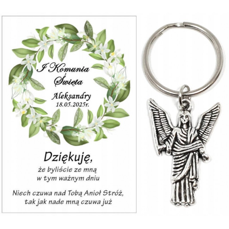 PAMIĄTKA PREZENT UPOMINEK DLA GOŚCI - BRELOCZEK ANIOŁ Z OZDOBNĄ KARTECZKĄ NA KOMUNIĘ