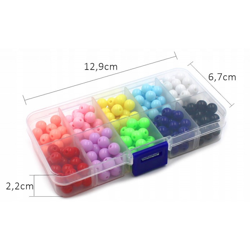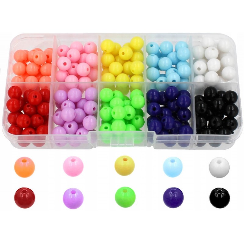 W zestawie znajdują się koraliki akrylowe 8mm po 25szt w każdej przegródce. Zestaw zawiera 10 różnych kolorów.